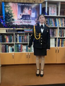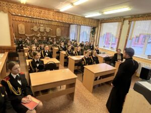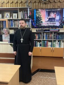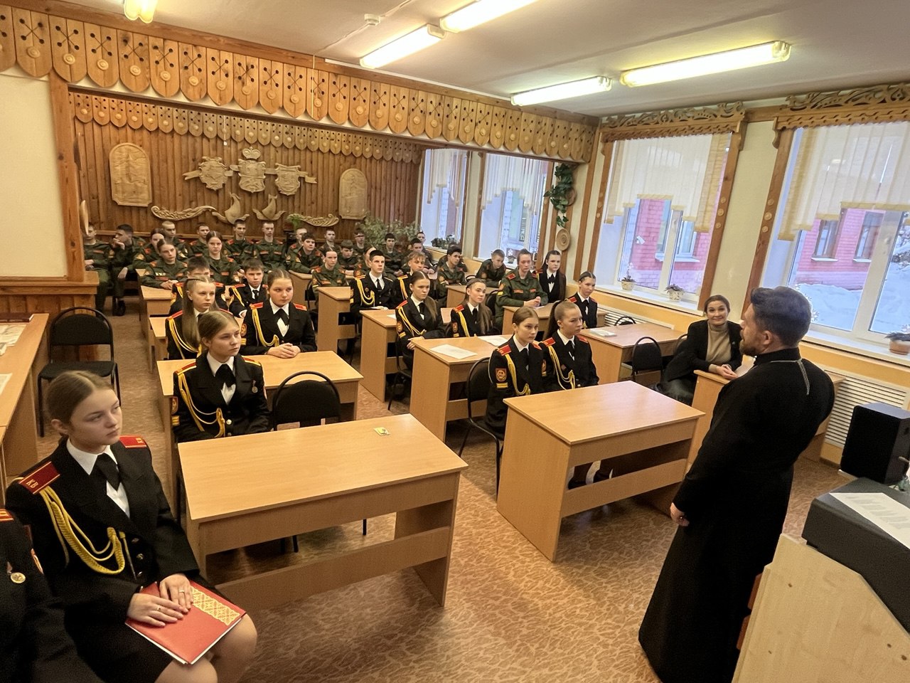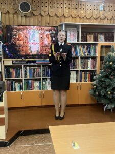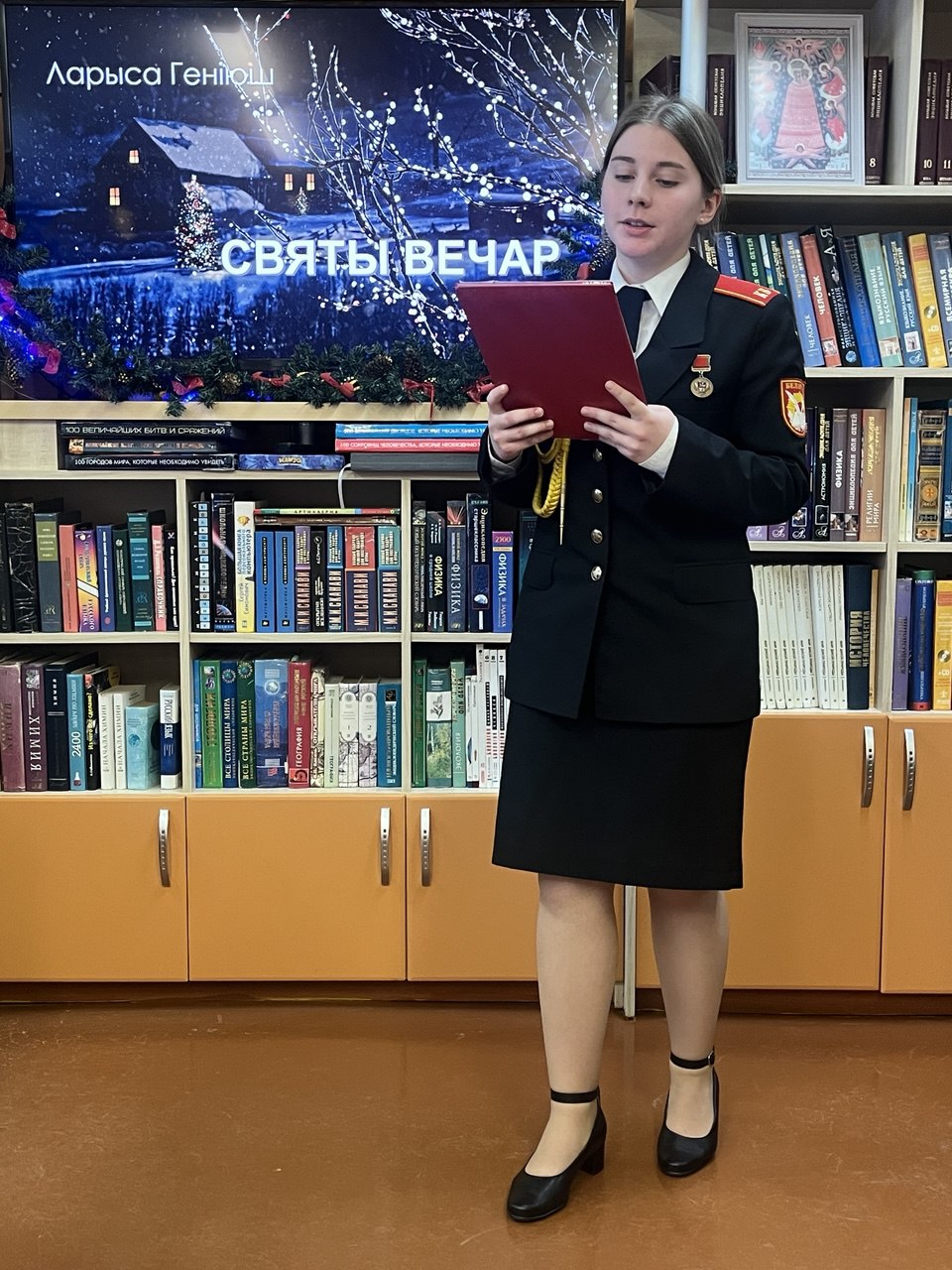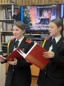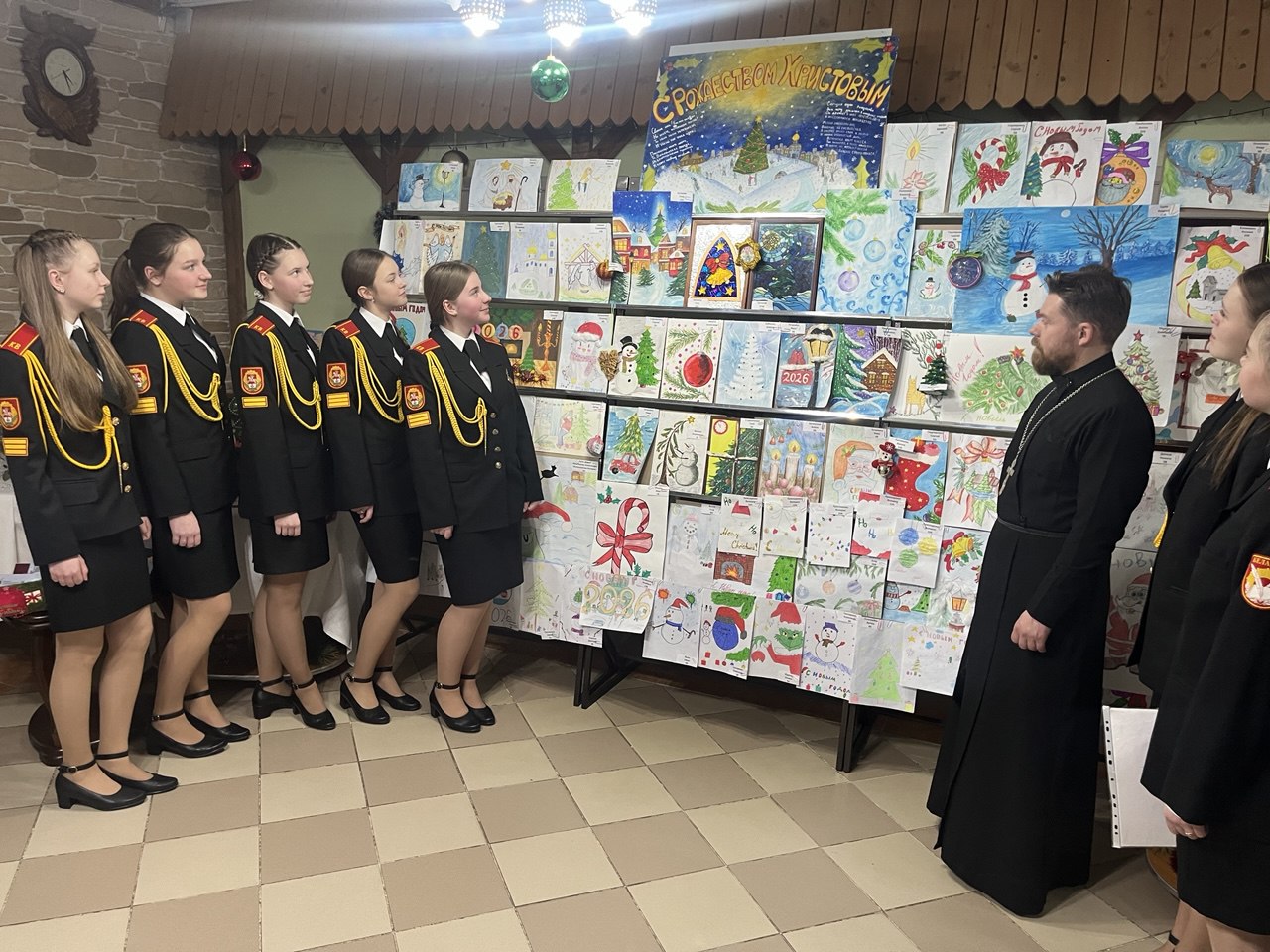 Гостем мероприятия был настоятель Свято-Вознесенского Храма деревни Лужесно, проректор по воспитательной работе Витебской духовной семинарии иерей Дионисий Андреев. Участники гостиной вспомнили историю Рождества Христова, традиции праздника, которые складывались веками. В читальном зале звучала красивая музыка Баха, Свиридова, Генделя, Грубера, Чайковского, Таривердиева, кадеты декламировали стихи Афанасия Фета, Александра Блока, Иосифа Бродского, Бориса Пастернака, Владимира Набокова, Ивана Бунина и других поэтов. Отец Дионисий поделился своими впечатлениями о посещении Вифлеема, побеседовал с кадетами о смысле праздника Рождества Христова, о значении этого события для всего человечества, о традиции рождественских подарков, которая заключается в желании доставить радость другим. Какое Рождество без христославов? Отец Дионисий пропел гимн праздника Рождества Христова «Рождество Твое, Христе Боже наш…», рождественскую колядку. Кадеты показали отцу Дионисию выставку своих творческих работ, подготовленных к празднику Рождества Христова. Эта встреча наполнила сердца и души всех присутствующих теплом, радостью, светом надежды и любви.