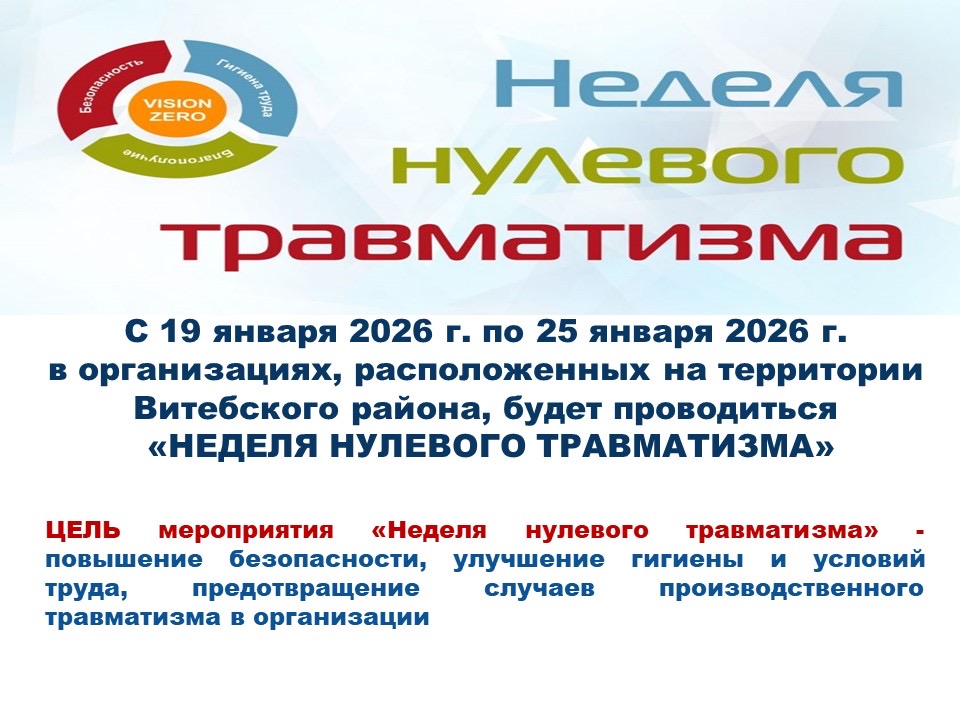 С 19 января 2026 г. по 25 января 2026 г. в организациях, расположенных на территории Витебского района, будет проводиться «НЕДЕЛЯ НУЛЕВОГО ТРАВМАТИЗМА».